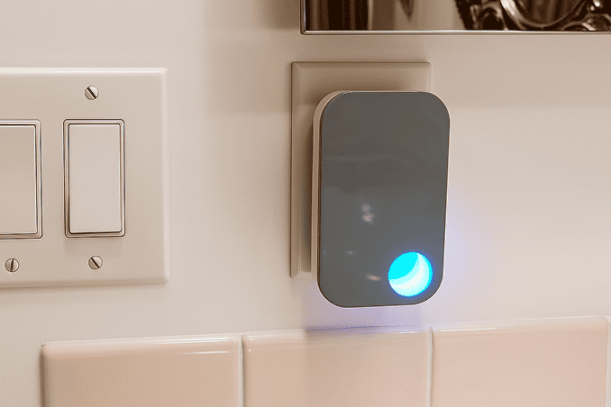 So when the device is in the wall, if you push the button to the left (all the way to the left) the blue LED light will be on and the ionization process is off. So Mode 1 works as a nightlight.