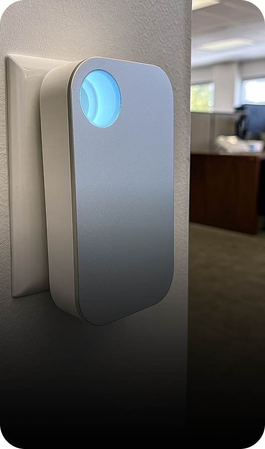 Watch the gentle blue glow. It’s silently generating ions that trap pollutants.